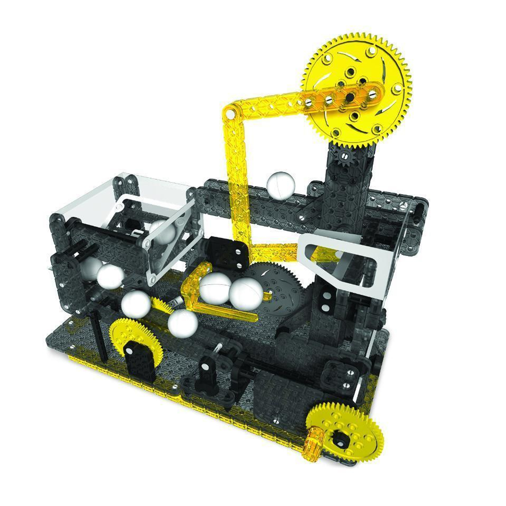 Изучите вживую красоту кинематического движения с новой машиной вилочного подъемника шаров VEX Robotics "Шариковая машина". Эта хитроумная машина с кривошипно-шатунным механизмом может выполнять как зачерпывающее, так и подъемное движение своим специальным рычагом вилочного подъемника. Машина приводится в движение ручкой и перемещает шары в непрерывном цикле со скоростью 1 шар в секунду (в набор включено 8 шаров).