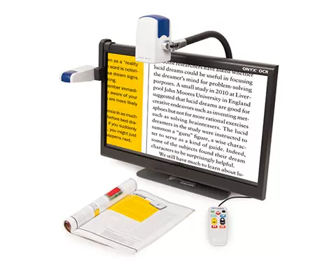 ONYX OCR объединяет преимущества нескольких видеоувеличителей в одном дизайне. Благодаря этому решению «четыре в одном», вы можете увеличивать текст на своем столе, писать, заниматься хобби, просматривать изображения на расстоянии (удалённый просмотр), видеть себя и даже слушать документы, поскольку они читаются вслух! Вы можете удобно переключаться между чтением увеличенного текста и прослушиванием документов. Просто разместите свой документ под фиксированной камерой OCR с левой стороны увеличителя, коснитесь сенсорного экрана и наслаждайтесь прослушиванием текста, не напрягая глаз.