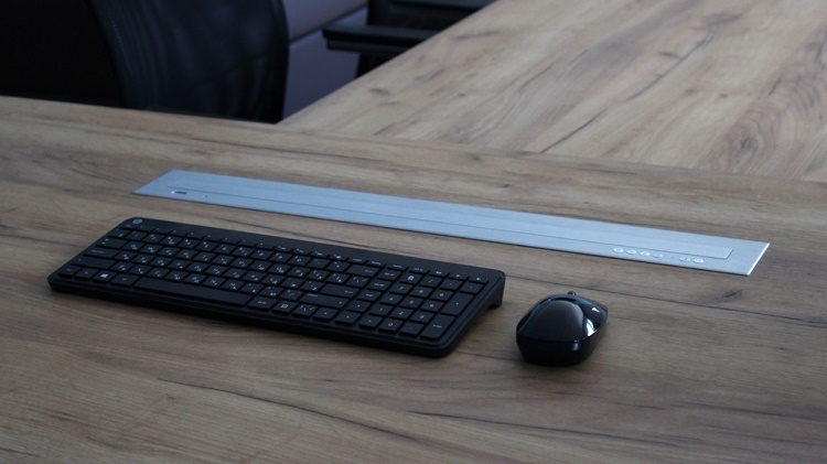 Современное технологичное решение встроить компьютерное оборудование в стол позволяет трансформировать рабочее место под любое мероприятие, будь то переговоры, совещание или онлайн-встреча. Для этого надо лишь выпилить в столе соответствующее размеру монитора отверстие, поместить в него моторизированный подъемный механизм со встроенным моноблоком и подключить систему к питанию.