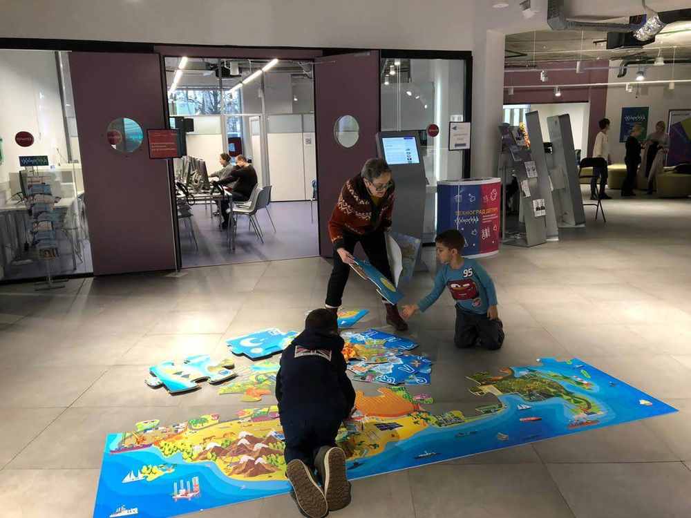 Отраслевая карта: карта условного мира, включающая в себя более 30 отраслей экономики, размер карты 2х3 метра, карта выполнена в виде полноцветного гигантского пазла, который включает 35 элементов.