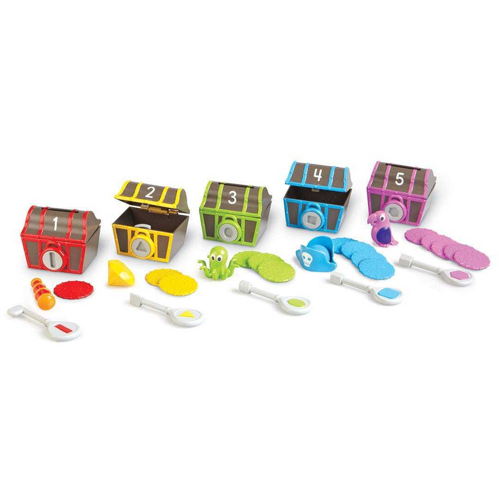 Замочки на сундучках имеют разные геометрические формы, каждому сундучку соответствует свой ключик, на котором изображена та же фигура и конец ключика по форме соответствует замочку. На сундучках есть отверстия, как на копилках, поэтому в них можно опускать монетки нужных цветов: количество монеток соответствует цифре, написанной на каждом сундучке. Также в наборе 5 фигурок пиратской атрибутики, которые также можно поместить в сундучки.