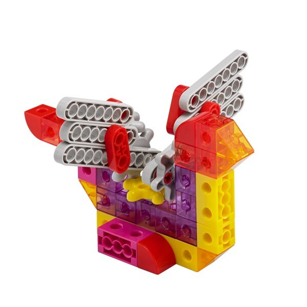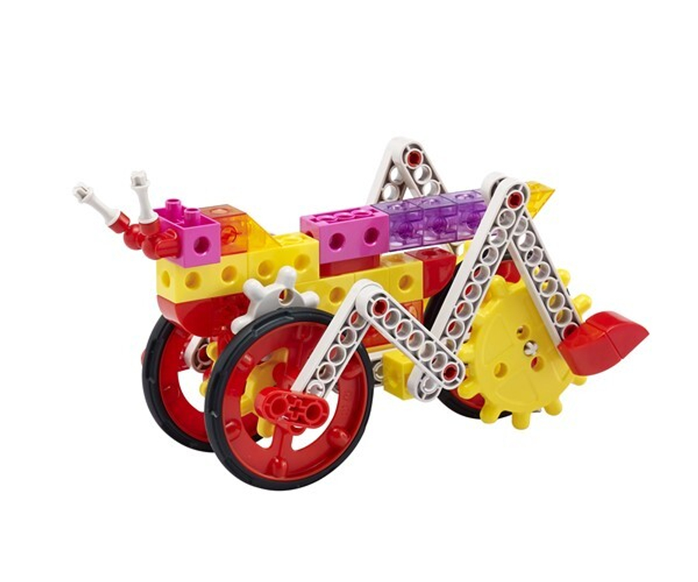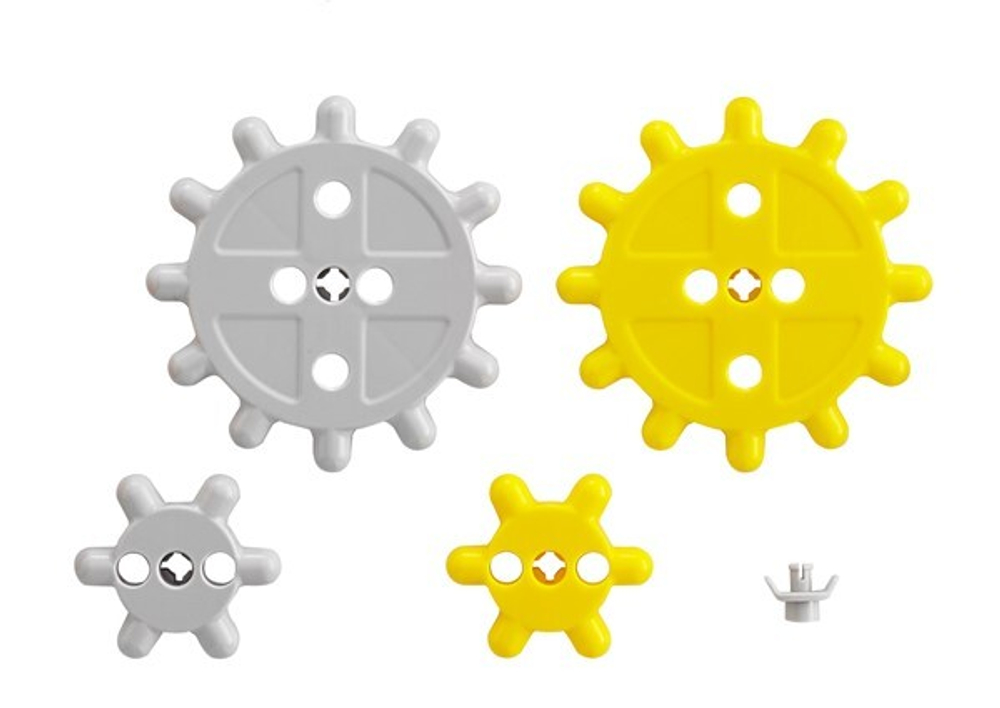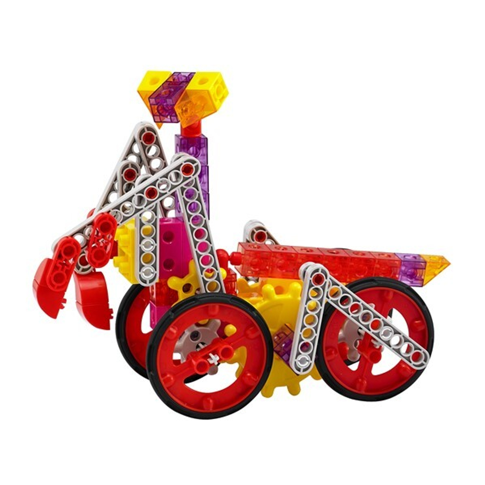 Набор включает в себя 122 детали (шестеренки, колеса, оси, кубики, и др.), а также инструкцию на английском языке.