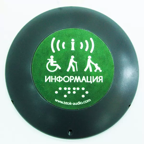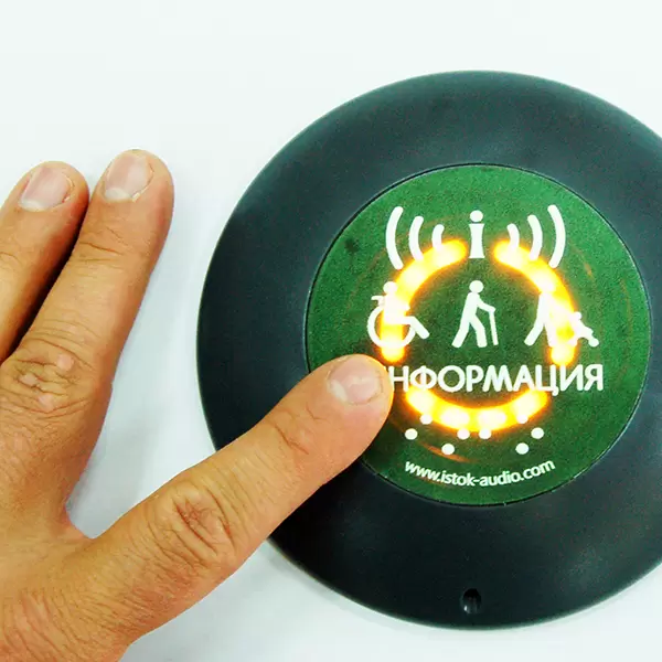 Кнопка с передатчиком сигнала беспроводная антивандальная для людей с инвалидностью — располагается на стене, недалеко от базового блока, при нажатии на кнопку базовый блок воспроизводит предварительно записанное звуковое сообщение. Кнопка может размещаться как внутри, так и снаружи помещения, температурный диапазон позволяет использовать ее в регионах с самыми разными климатическими условиями. Надписи на лицевой стороне кнопки выполнены выпуклым шрифтом и дублируются надписью шрифтом Брайля. Корпус устройства выполнен из антивандального пластика, а специальная форма позволит уберечь кнопку от кражи. Благодаря большой зоне нажатия и подтверждению вызова звуковым и световым сигналом пользоваться устройством могут все категории людей с ограниченными возможностями.